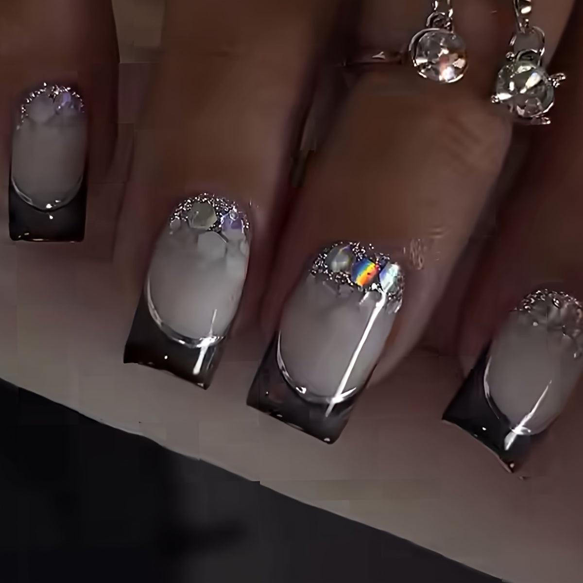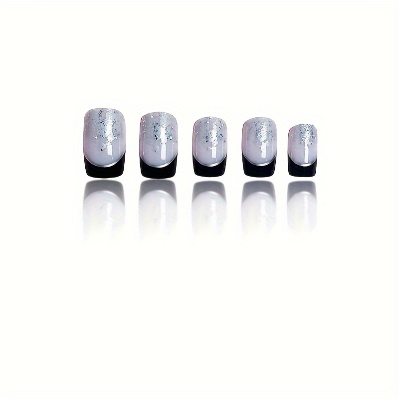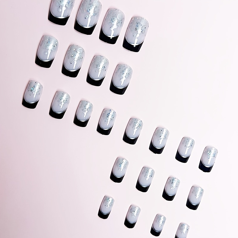 24pcs Fashionable Business Casual Elegant Daily Modern European Black French-Style Silvery Line Glitter Medium Square Fake Nail Set for and Women, Instantly Enhance Your Style, False Nails, Press On Nails, French Manicure, Mo