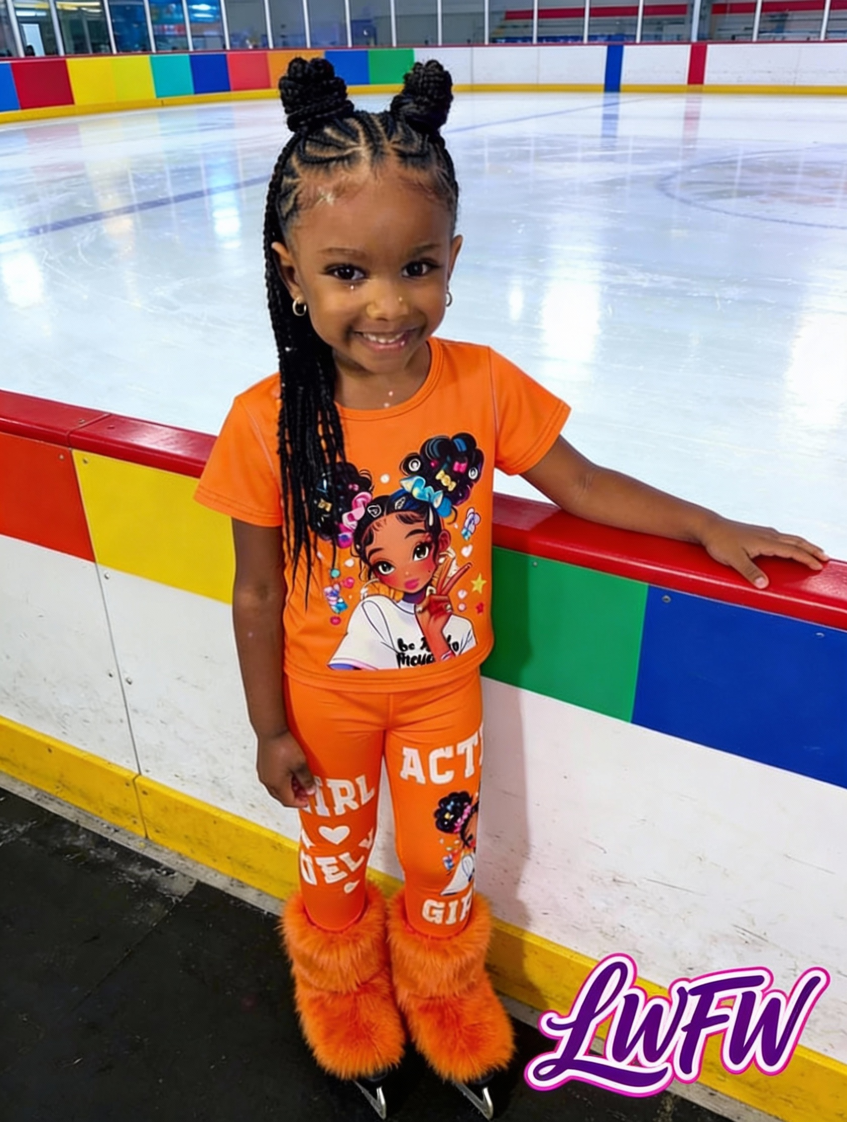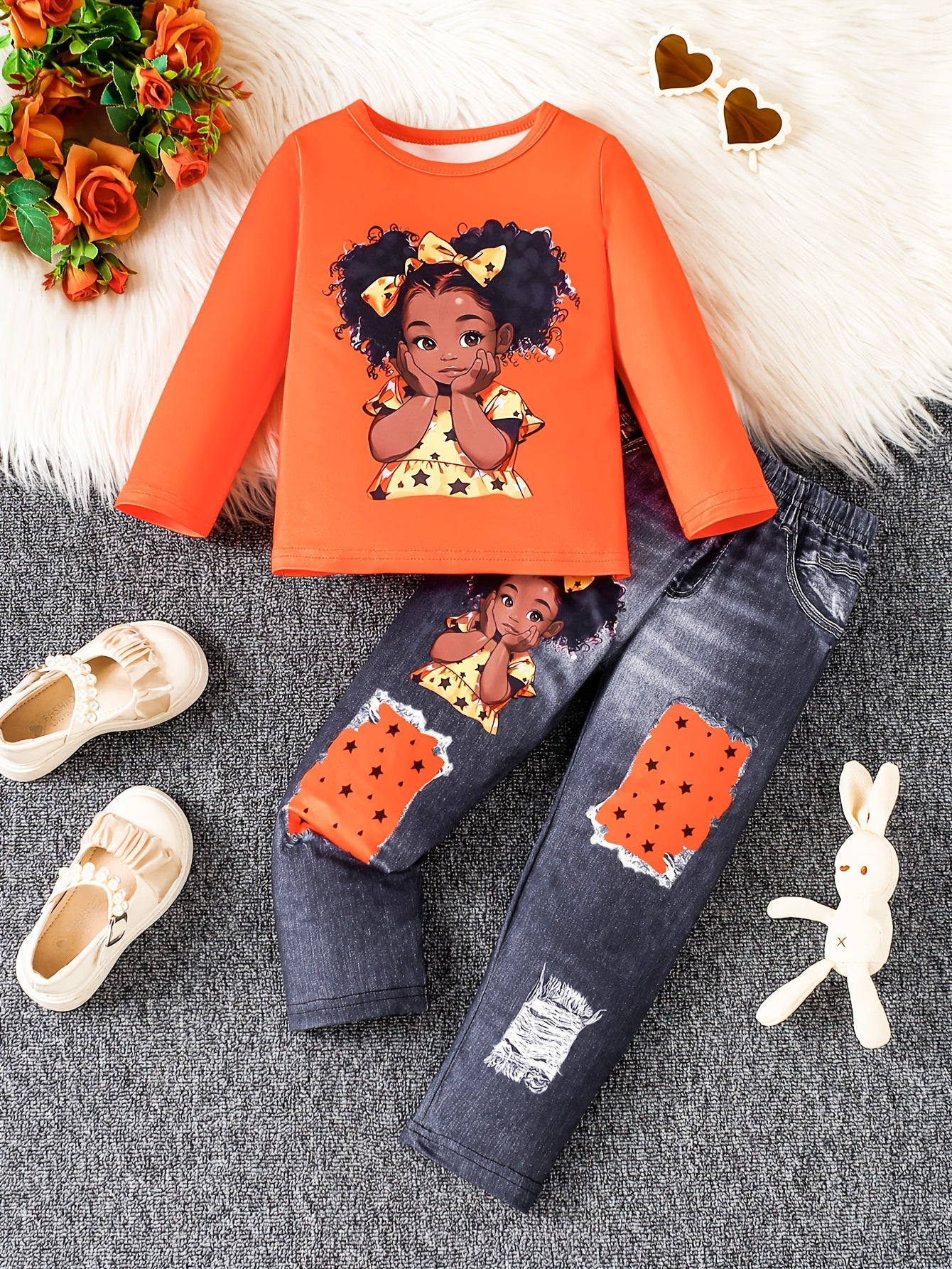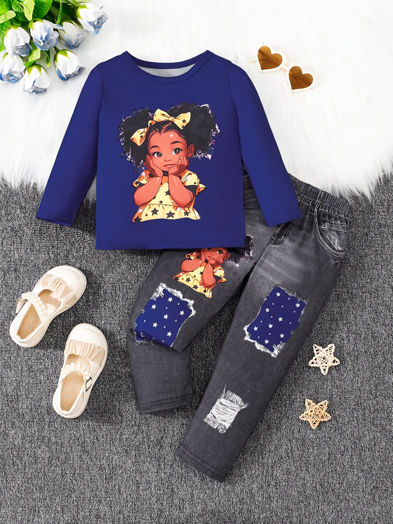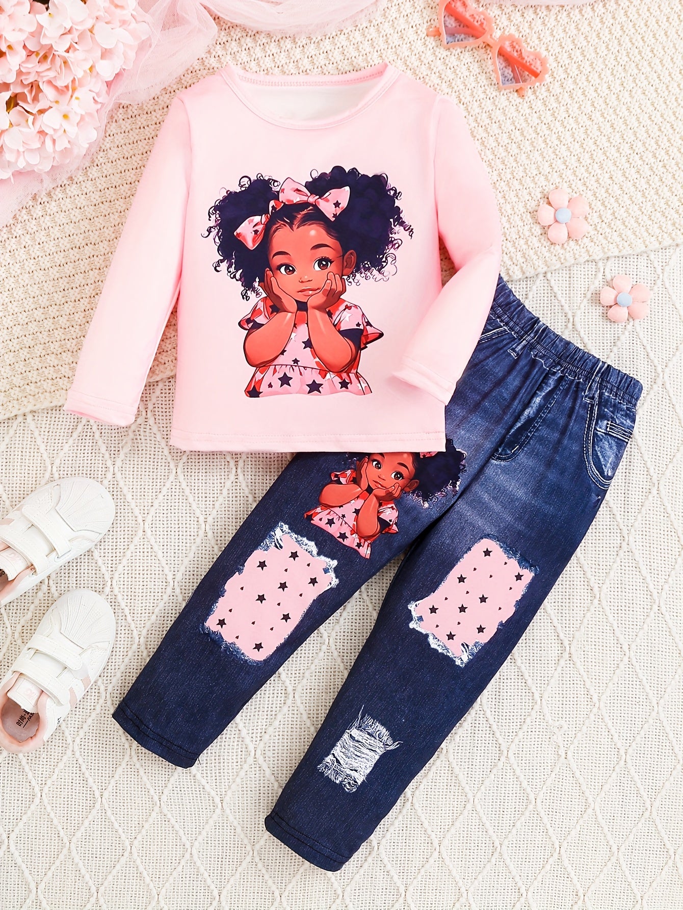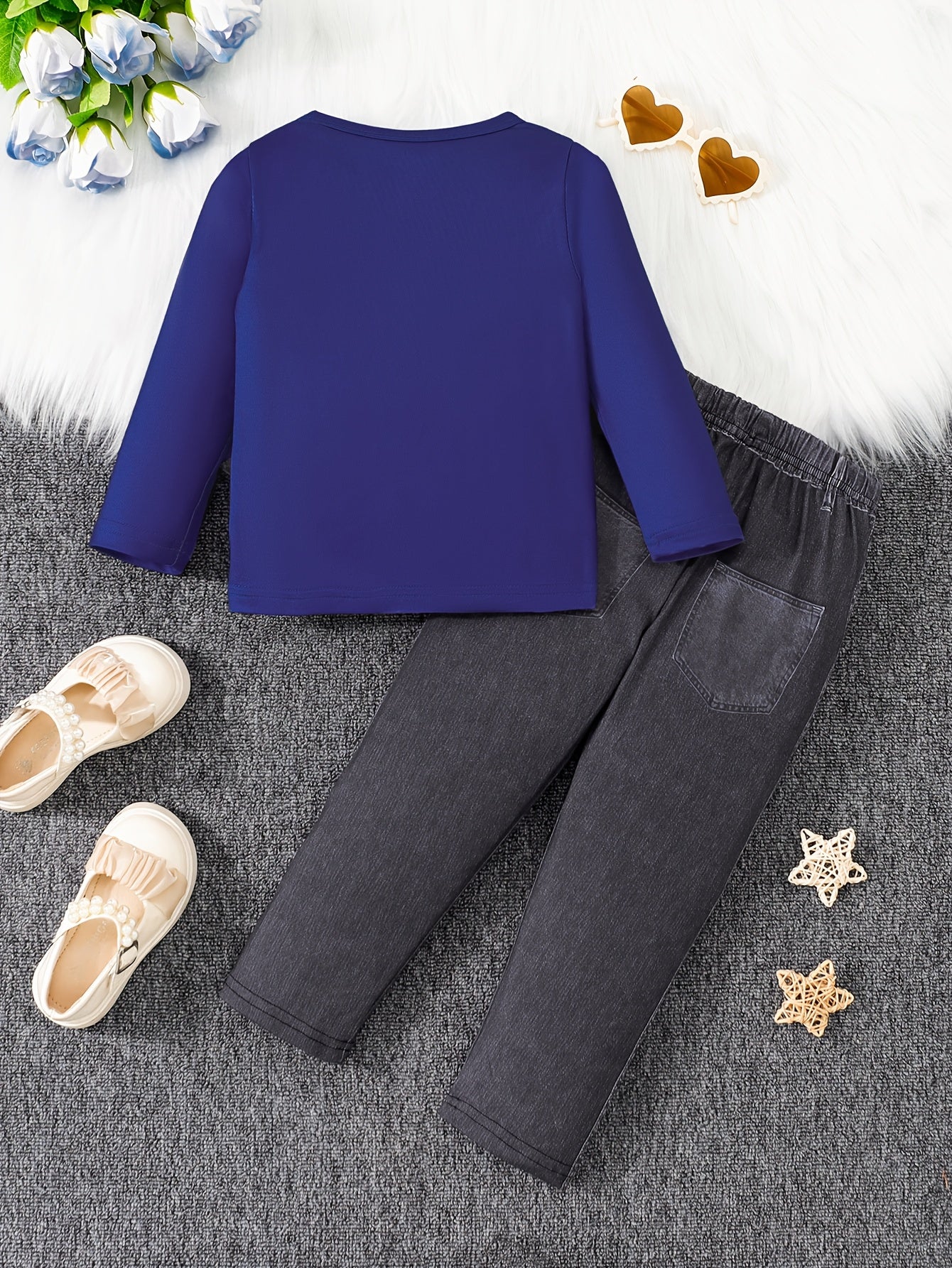 2pcs Girls' Cute Doll Print & Faux Denim Overalls Set - White Smock Dress + Blue Jeans-Like Leggings with Doll Face Print (Eyes/Nose/Mouth), Machine Washable Spring/Fall Outfit for Party, Everyday Play & Dress-Up , Perfect fo