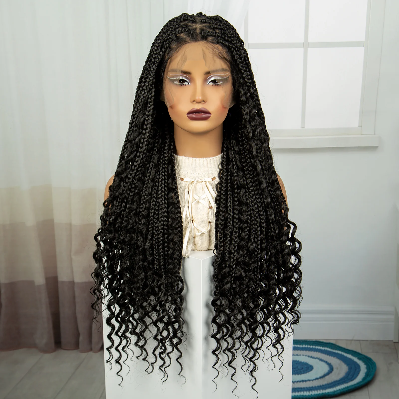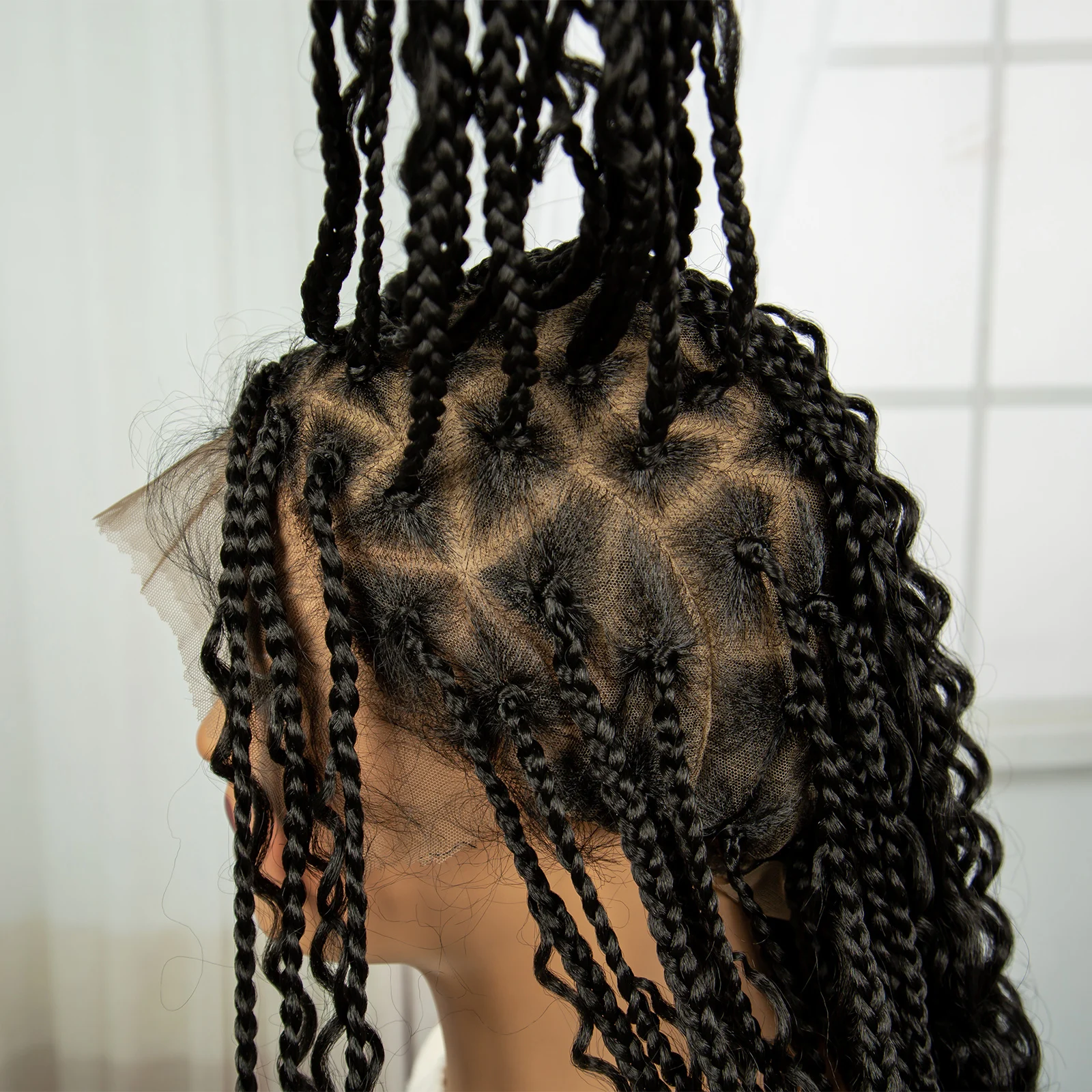 32 inch Synthetic Braided Wigs Natural Curly Boho Braideds Wigs Full Lace Knotless Box Braids Wig with Baby Hair for Black Women