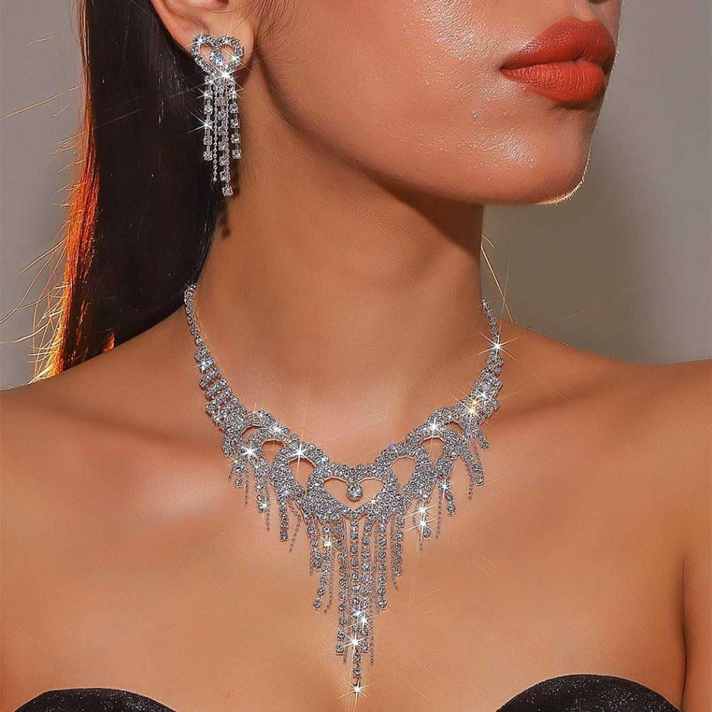 Bride Wedding Necklace Earrings Set Sliver Rhinestone Necklace Love Crystal Necklace Set Bride Bridesmaid Prom Necklace Accessories for Women