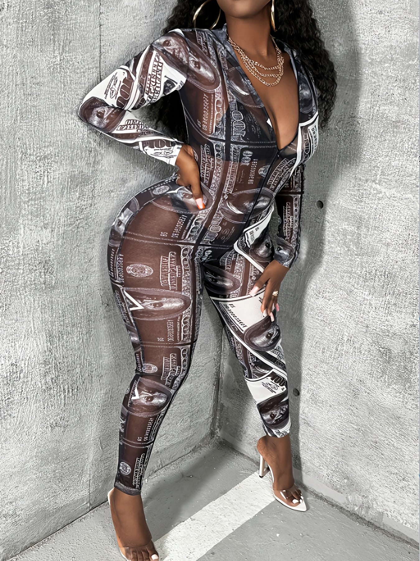 Full Lace Printed Fitted Jumpsuit, Ruched Neckline with Bag, Body-hugging Design, Stunning Neckline Back. The Wearable Face Body Wraps are Suitable for Women at All Ages, Making Anyone Smaller and Lovelier.