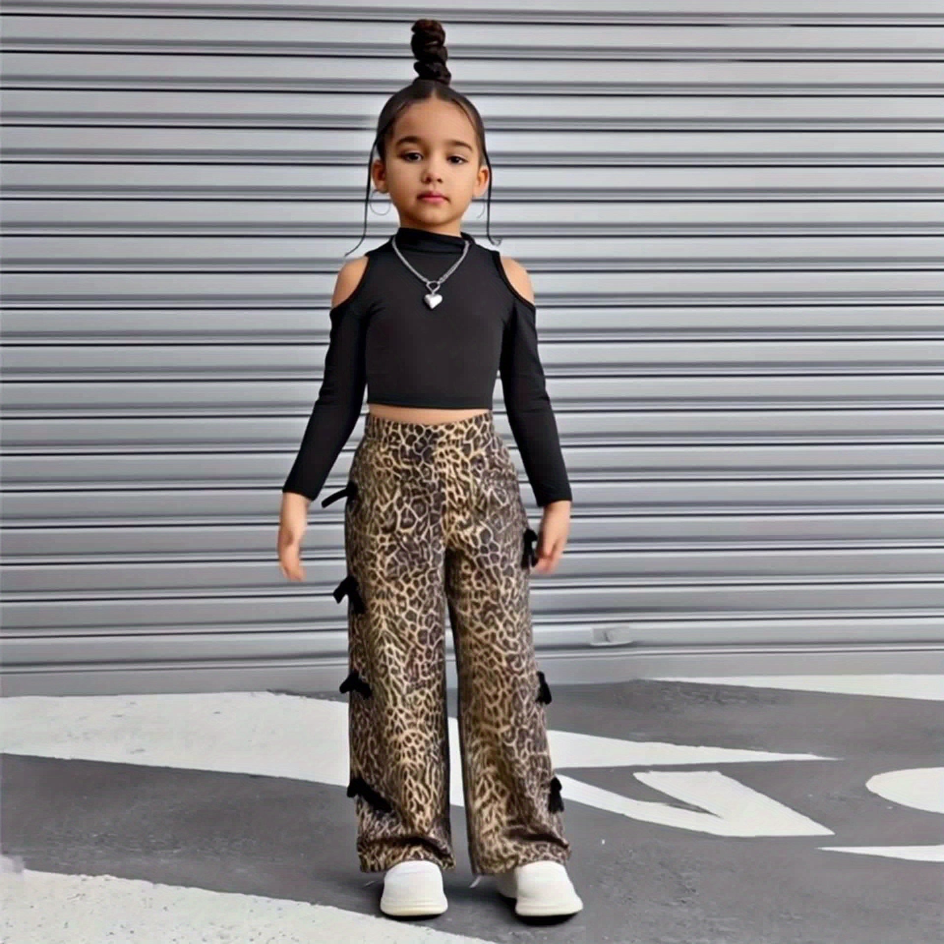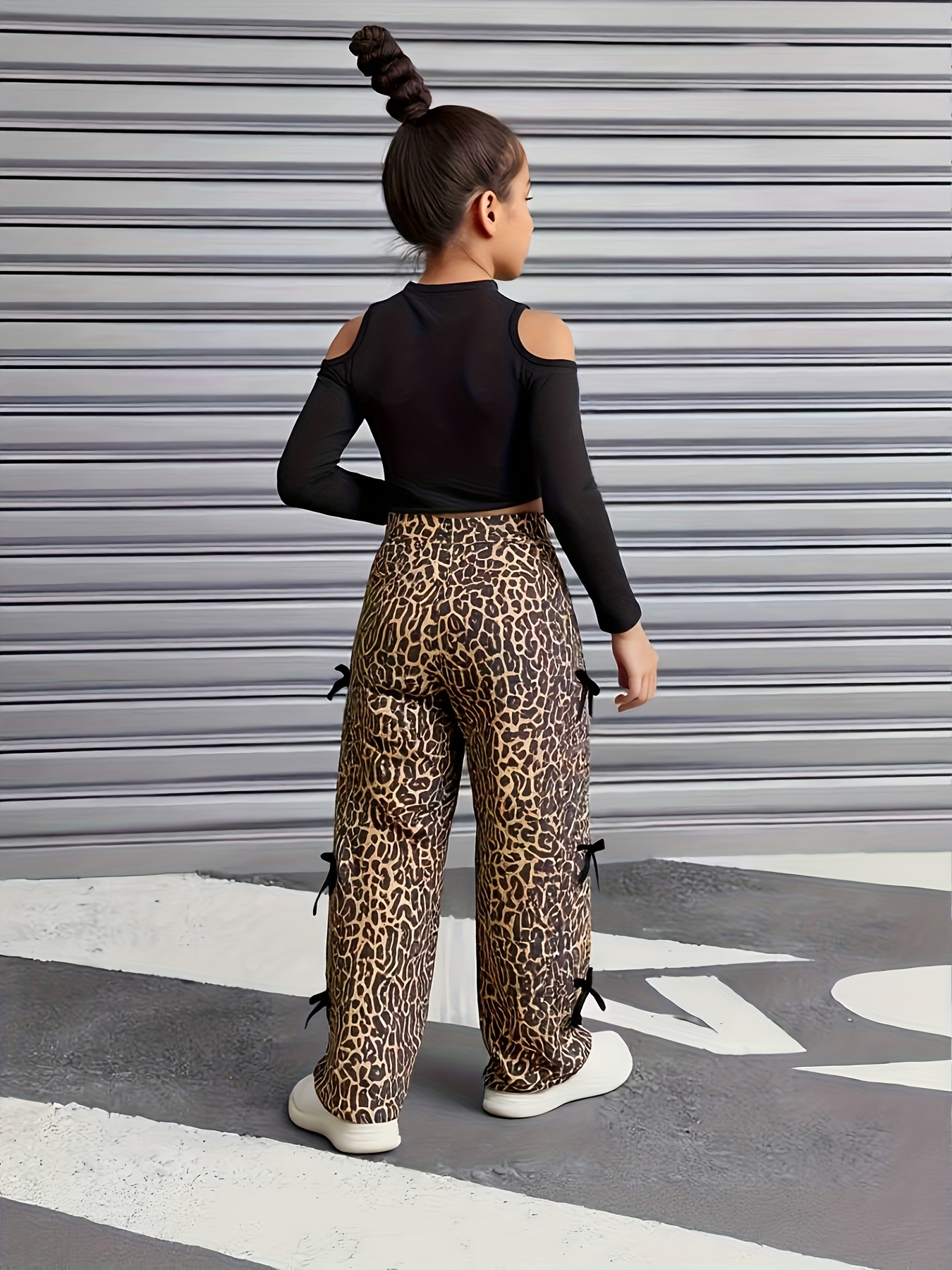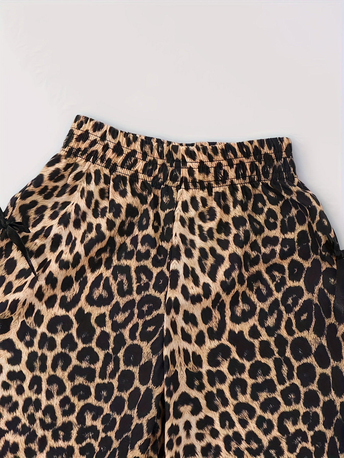 Girls' Leopard Print Wide-Leg Pants - High-Stretch Casual Loose Fit Long Trousers with Elastic Waistband, All-Season Comfort for Casual Attire, Leopard Print Pants, Comfortable Clothing, Trendy Youth Fashion, Durable Fabric,