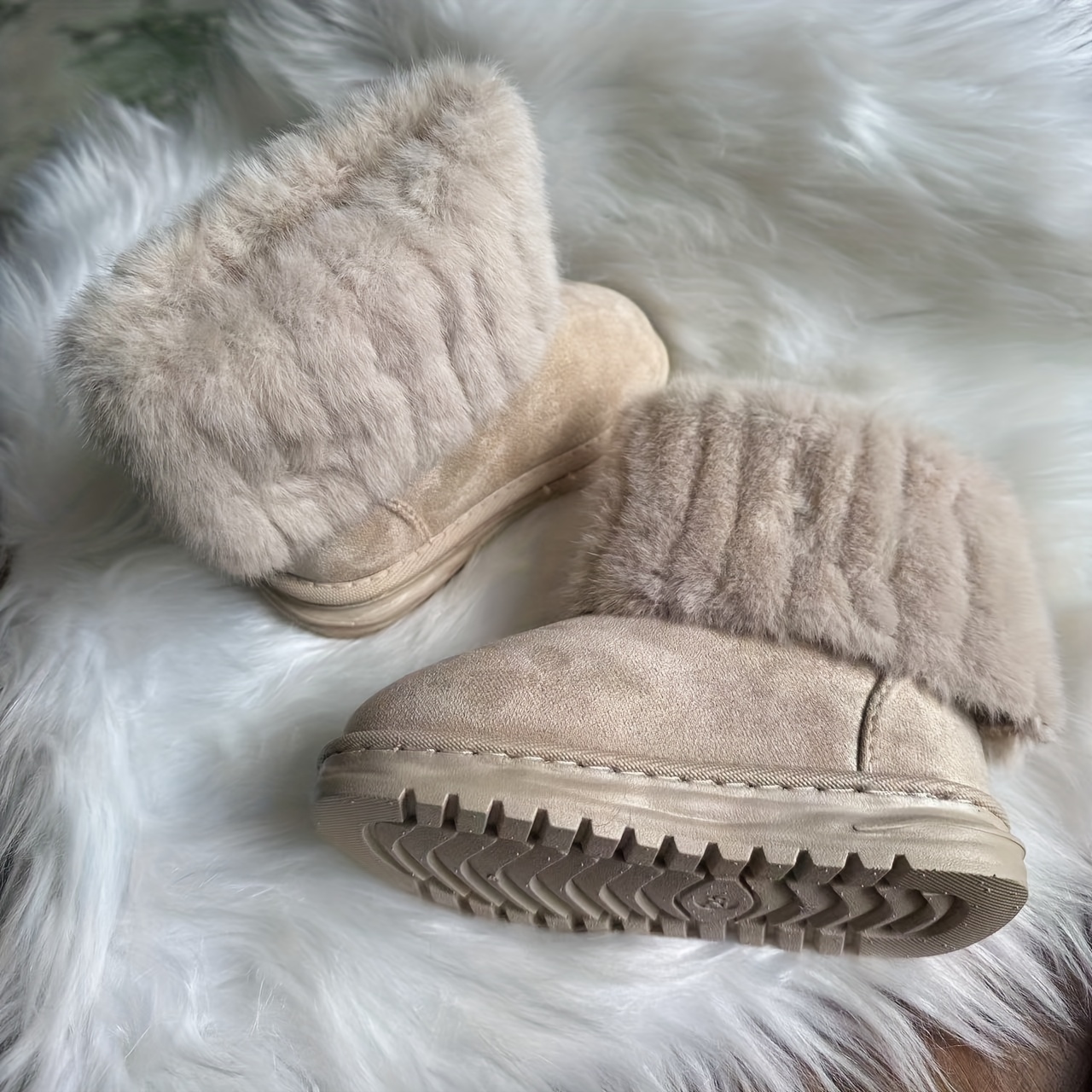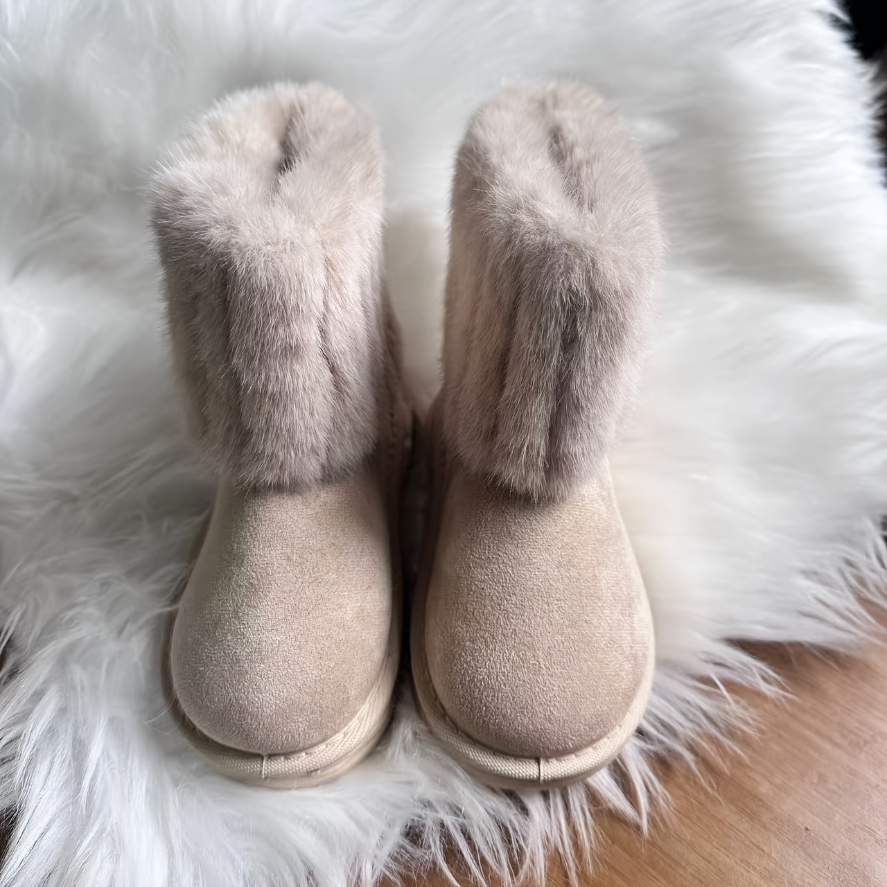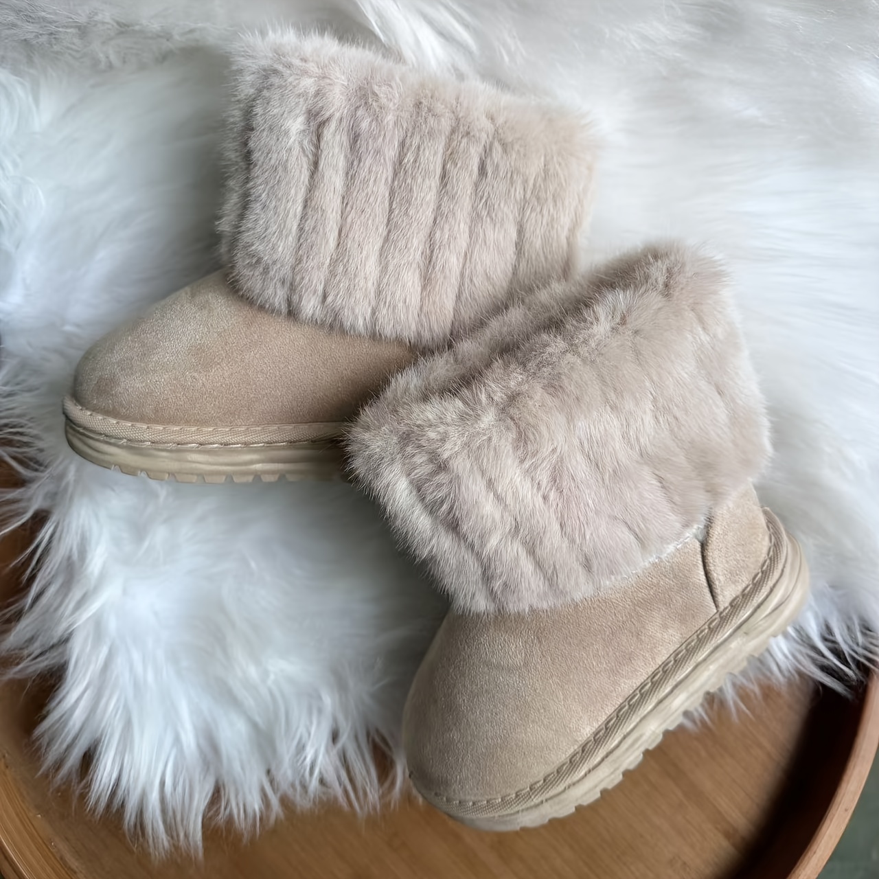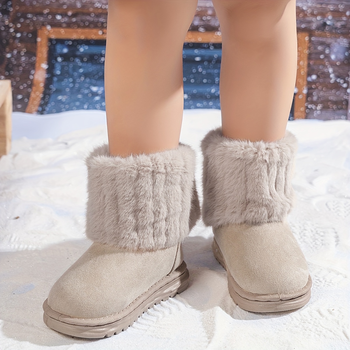 Girls' Winter Warm Slip-Resistant Mid-Calf Boots With Thick Rubber Sole & Plush Collar - Beige Round Toe Snow Boots With Heart Cutouts, Soft Fabric Upper For Outdoor Play, Casual Casual Attire Beige, Pink, Blue, Black - Cozy