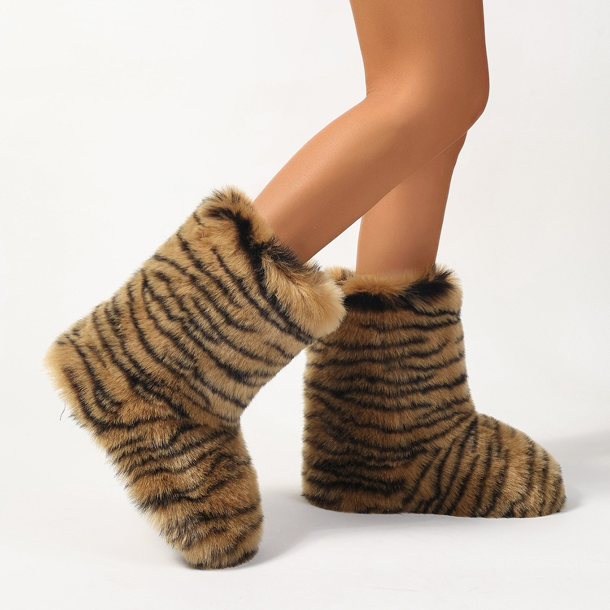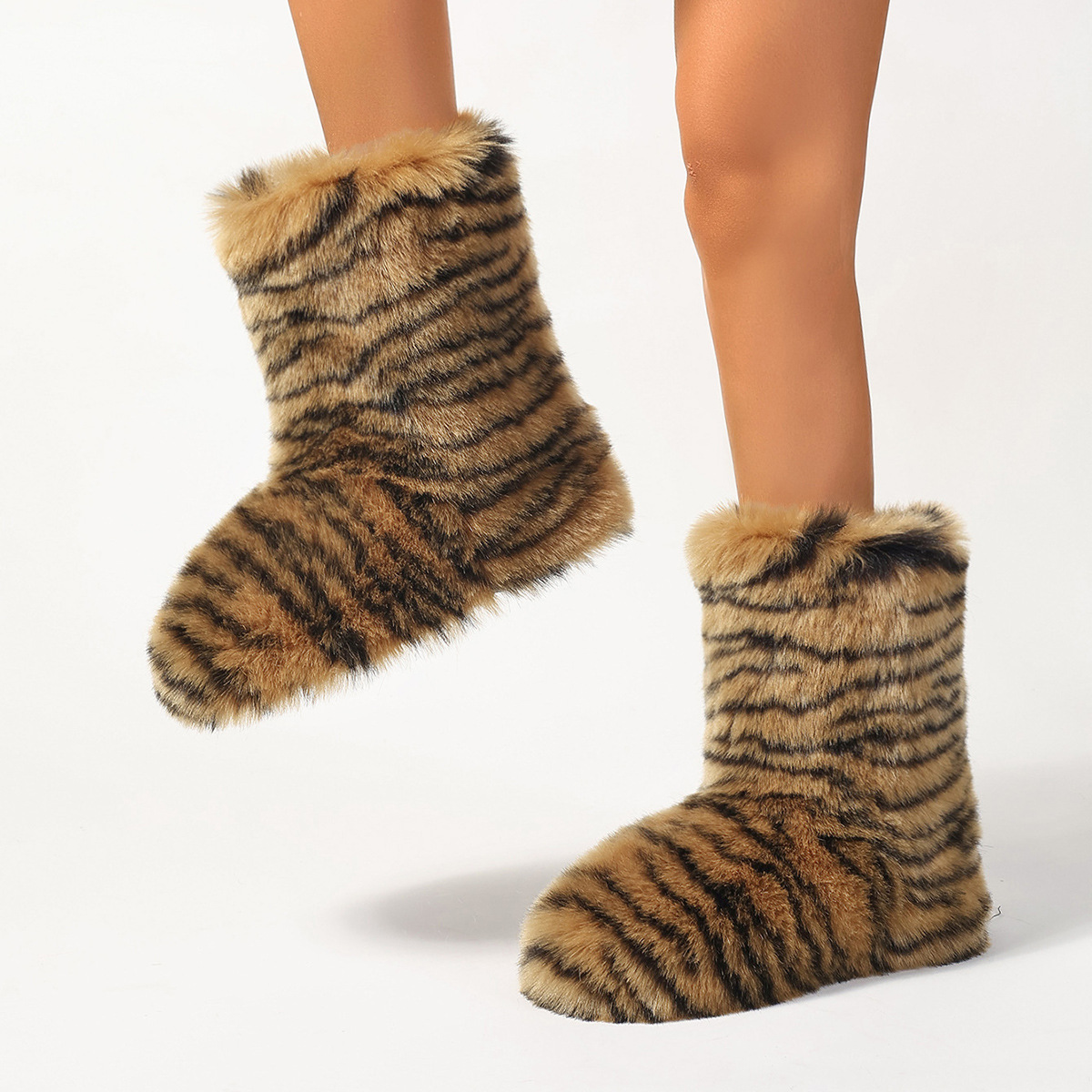 Kpop Winter Boots with Thick Sole & Leopard Print - Faux Fur Warm Round-Toe Slippers | Y2K Stage Outfits, Concert Footwear, Rubber Outsole for K-Drama Fashion (Microfiber Upper/ Cushioning)