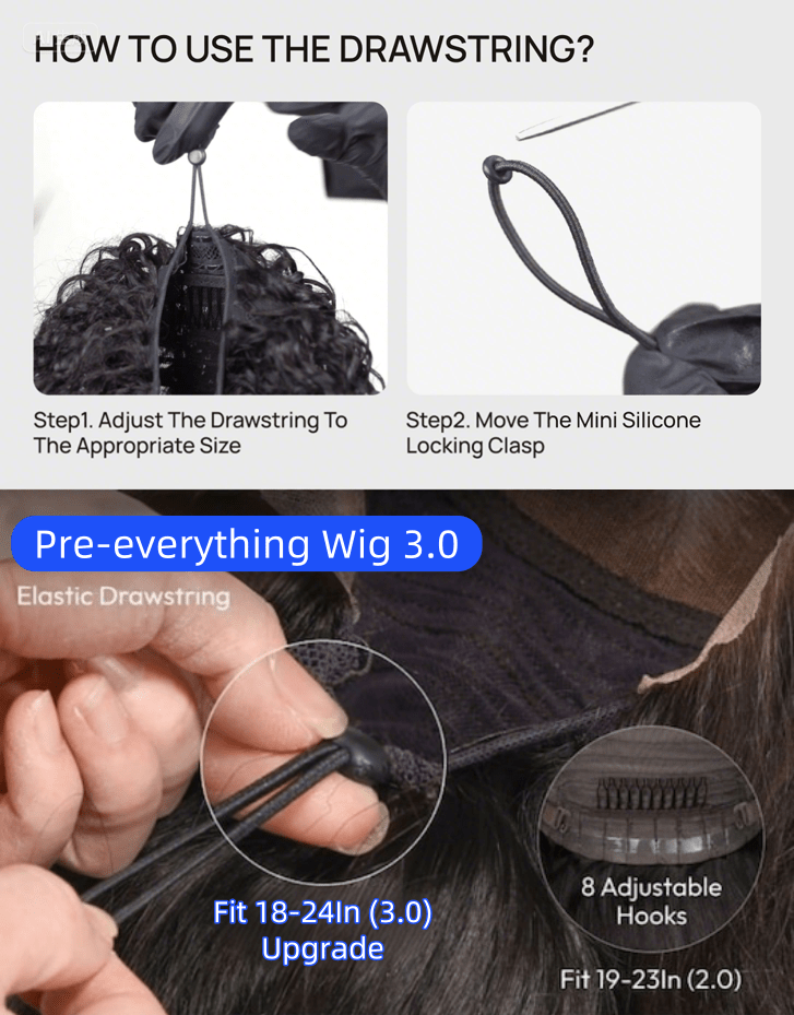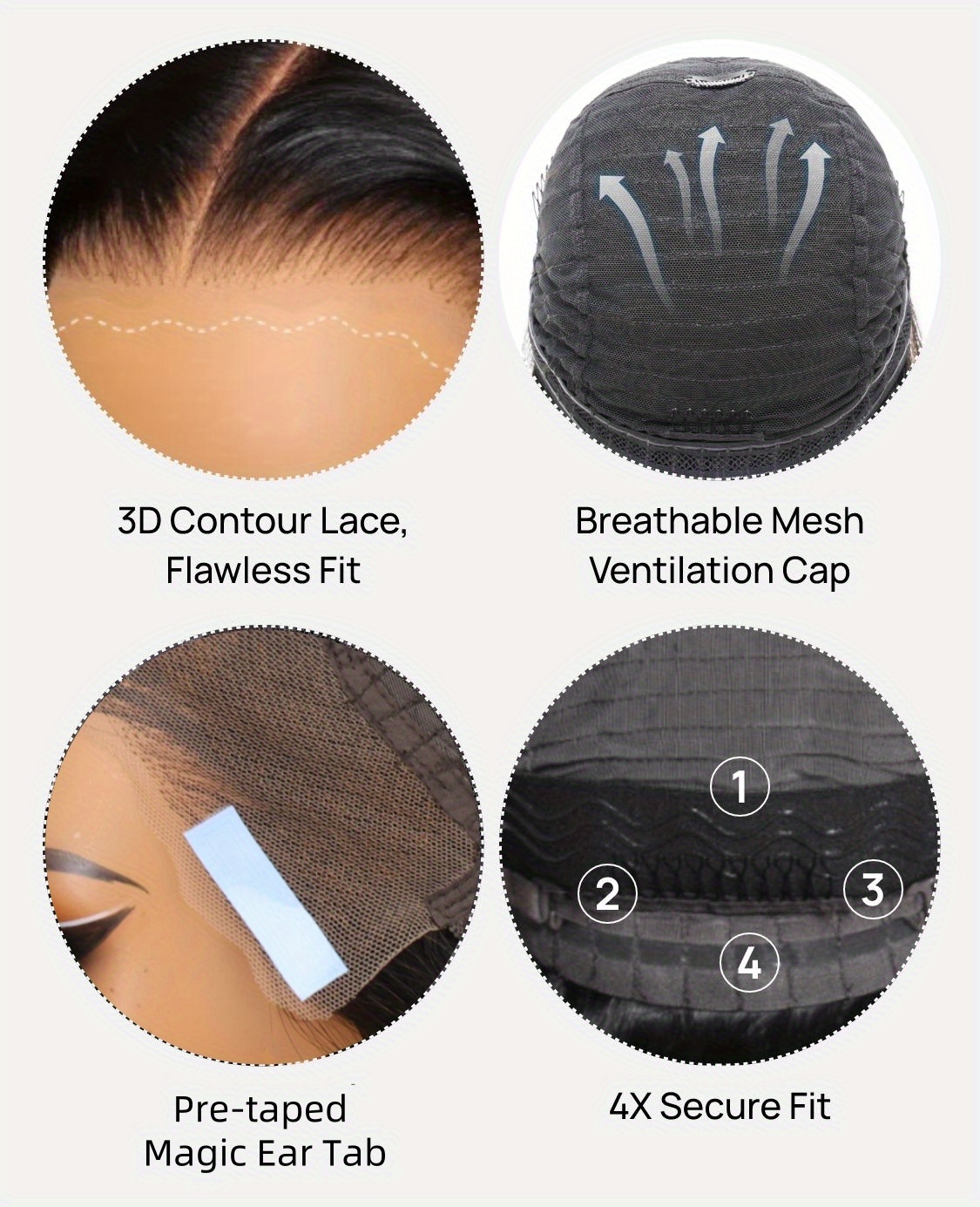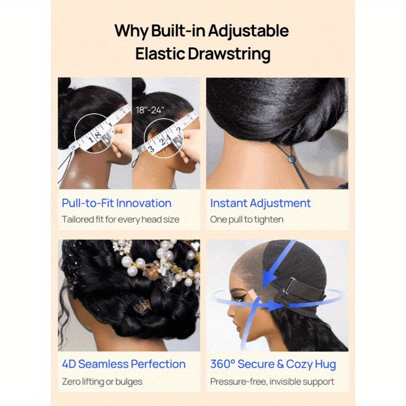4. Adhesive-free 13x4 Frontal Wig Cap – The medium cap size (18–24 inches) comfortably accommodates most head sizes. It features 2 adjustable straps, secure combs, and an elastic band to ensure the wig remains in position throughout the day. Lace dimensions: 13x4 HD lace (From front to nape: 13.5 inches; From ear to ear: 15.25 inches).