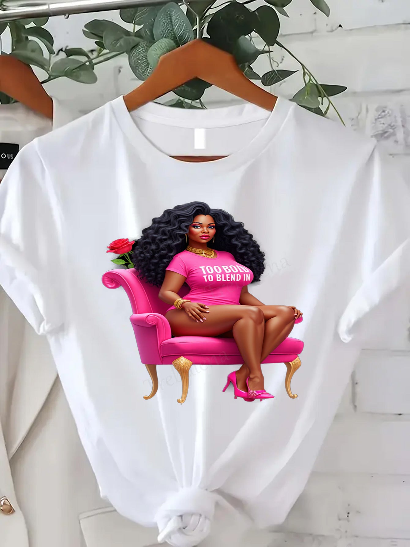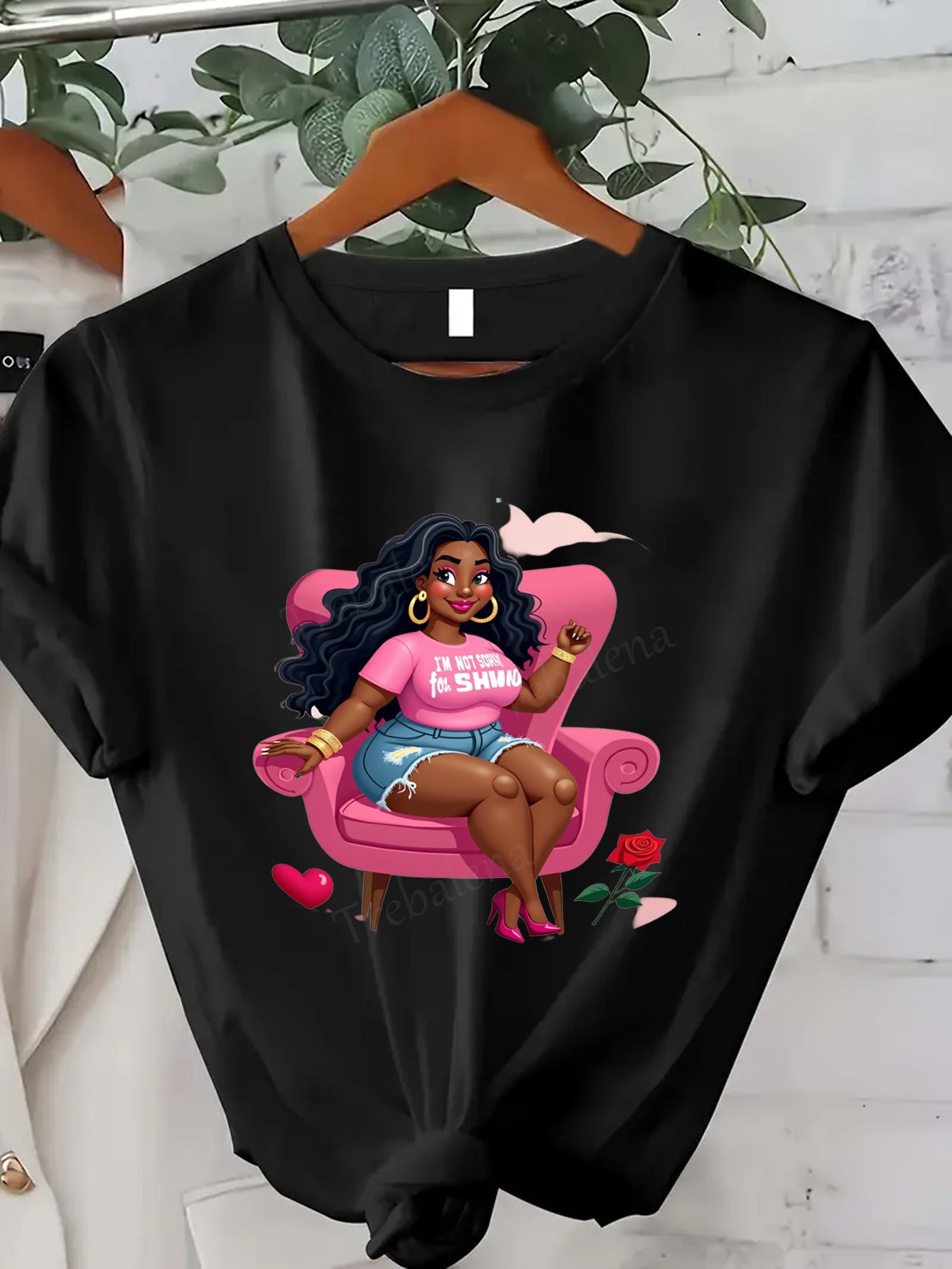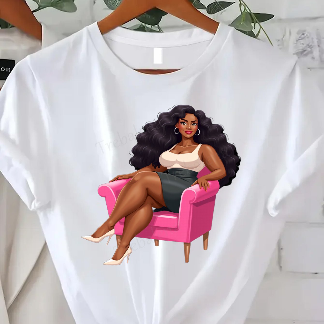 Plus Size, Trebalena Women's Plus Size Graphic T-Shirt - Sexy Curvy Lady in Pink Chair with Roses, Soft Breathable 100% Cotton Casual Everyday & Party Outfit - Perfect Halloween, Christmas, Birthday Gifts for Women - Non-See