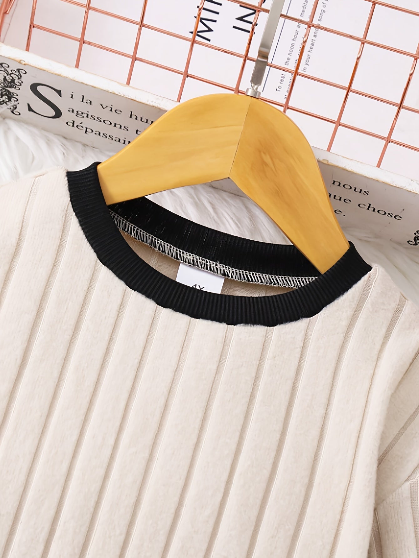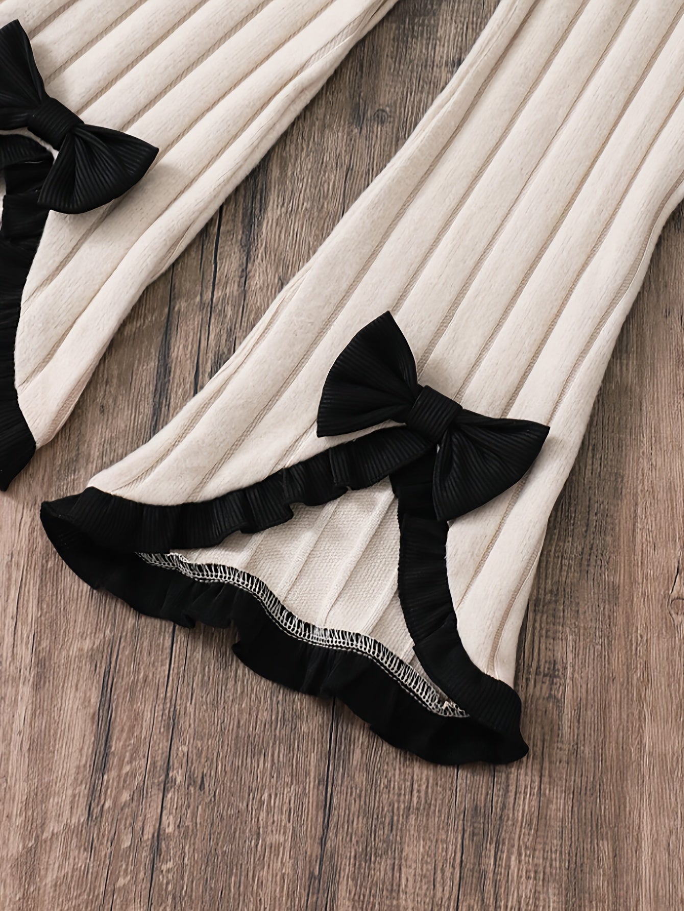 Targeted Development Two-Piece Autumn/Winter Girls' Round Neck Long Sleeve Ribbed Pullover + Bow-Trimmed Flared Pants Set, Gift Set for Girls, Perfect for Outdoor