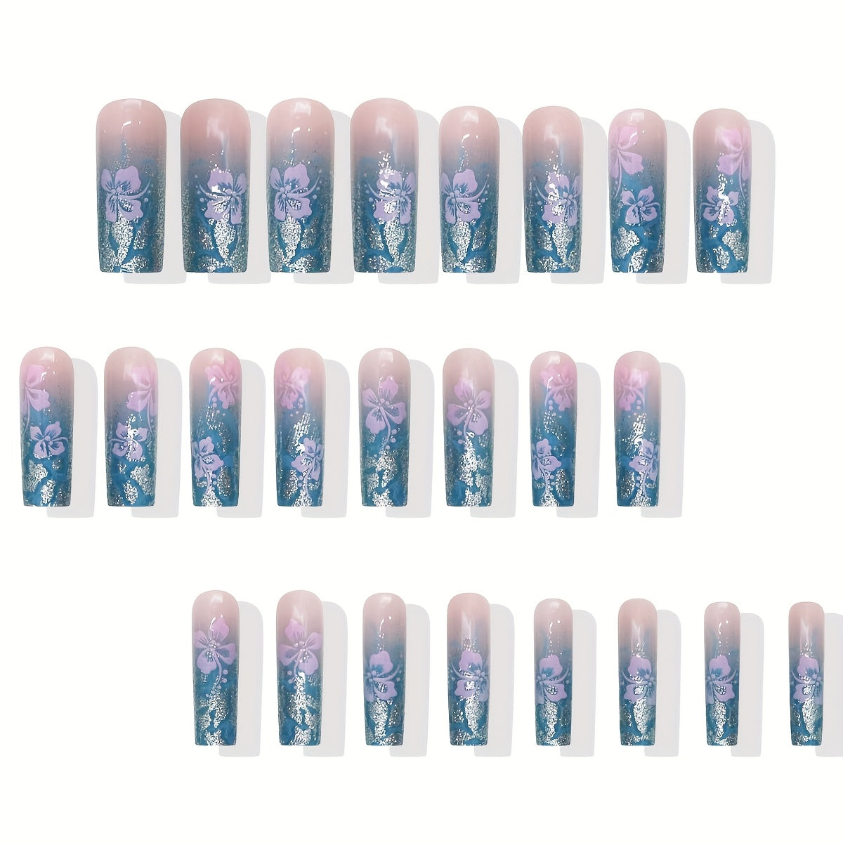 Upgrade Your Style, 24pcs Full Coverage Matte Artificial Nails with Purple Floral Pattern and Silvery Glitter Design for a Simple yet Elegant Look, Suitable for Daily Wear Nail Art