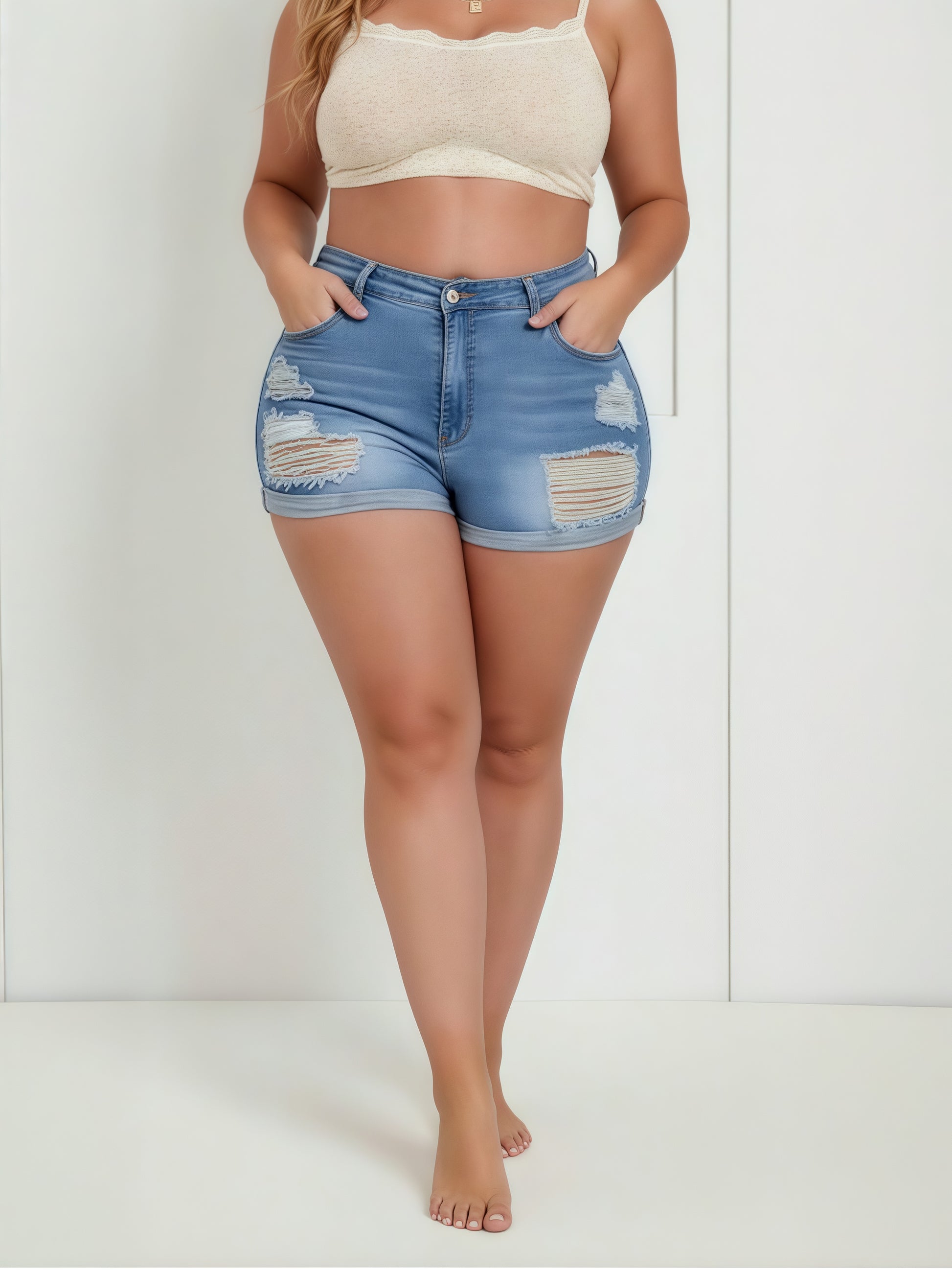 Women'S Large Size High Waist High Stretch Tight Denim Shorts | Multi-hole, Blue Classic, Plus Size 0XL-4XL, Button Fly Closure, Sexy Style, Spring/Summer Season, Ripped Details, WBLTRVE Brand