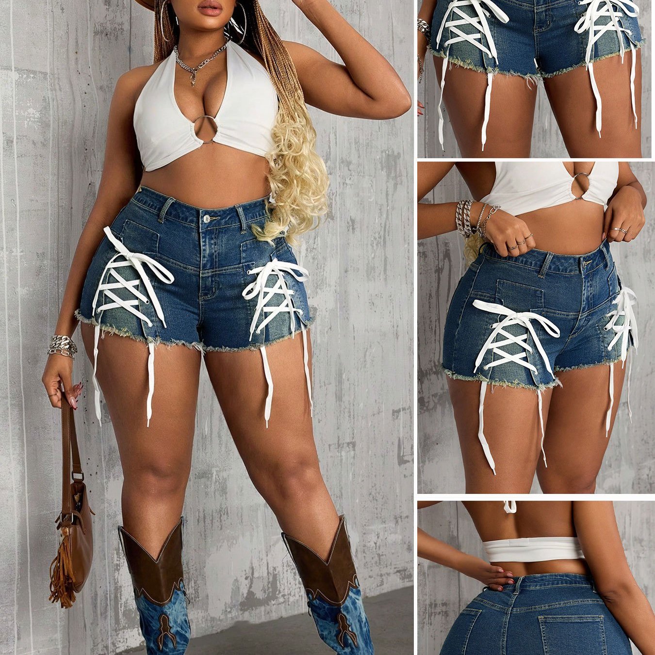 Women's Plus Size Stretch Denim Shorts - Sexy Skinny Super Short Jeans with Crisscross Drawstring Waist, High-Stretch Denim & Mid-Thigh Length for Summer Outfits, Casual Wear, Stylish Summer Apparel, Highstretch Fabric